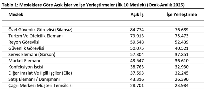 Mesleki bazda yapılan incelemelerde ise en çok işe alım yapılan alanlar sırasıyla “Özel Güvenlik Görevlisi (Silahsız), Turizm ve Otelcilik Elemanı ve Reyon Görevlisi” oldu.